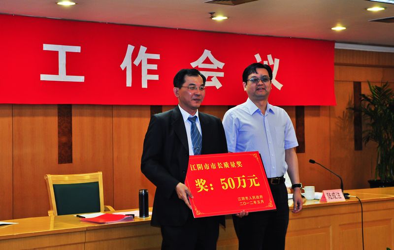 2012年在5月15日江阴市市政府召开的全市质量事情聚会上,,,,,,,ALLWIN·(china)集团官网喜获2011年度“江阴市市长质量奖”,,,,,,,费平副市长为ALLWIN·(china)集团官网揭晓了奖牌和50万元奖金。。。。。。。同期,,,,,,,ALLWIN·(china)集团官网还获得了江阴市政府授予的“江阴市卓越绩效治理树模基地”称呼。。。。。。。